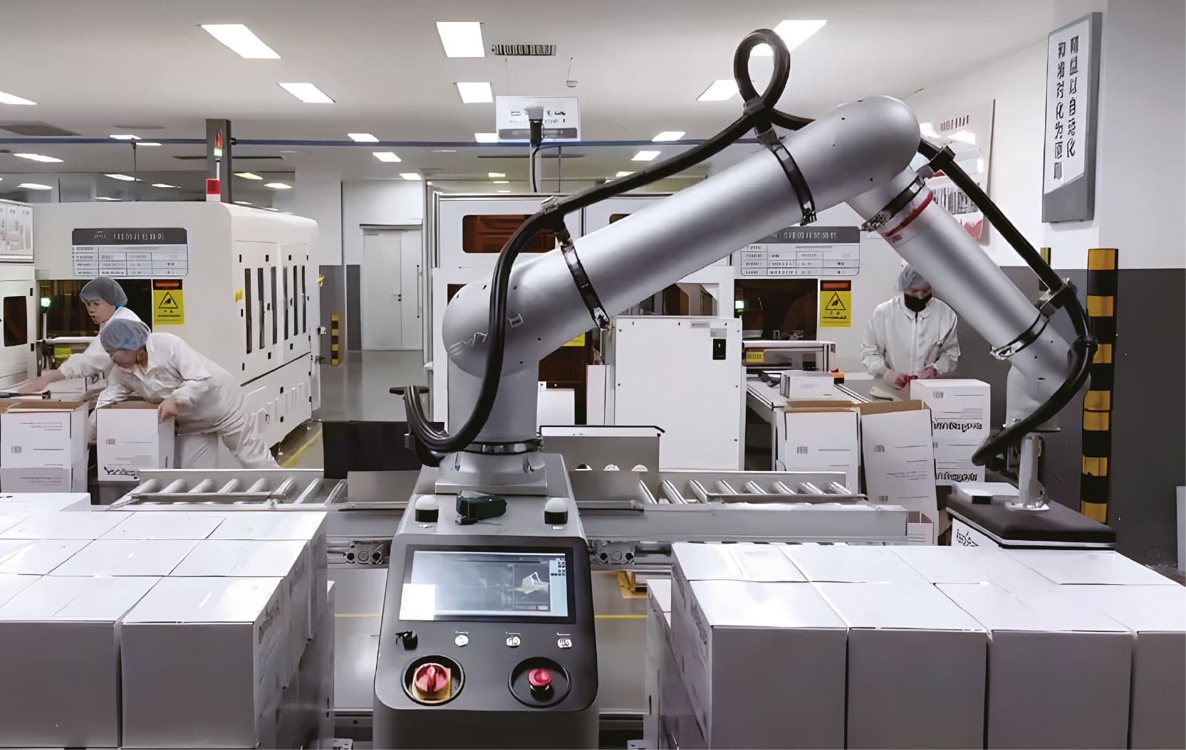 Robôs para tarefas repetitivas ou críticas, com ganho de produtividade, precisão e segurança.
